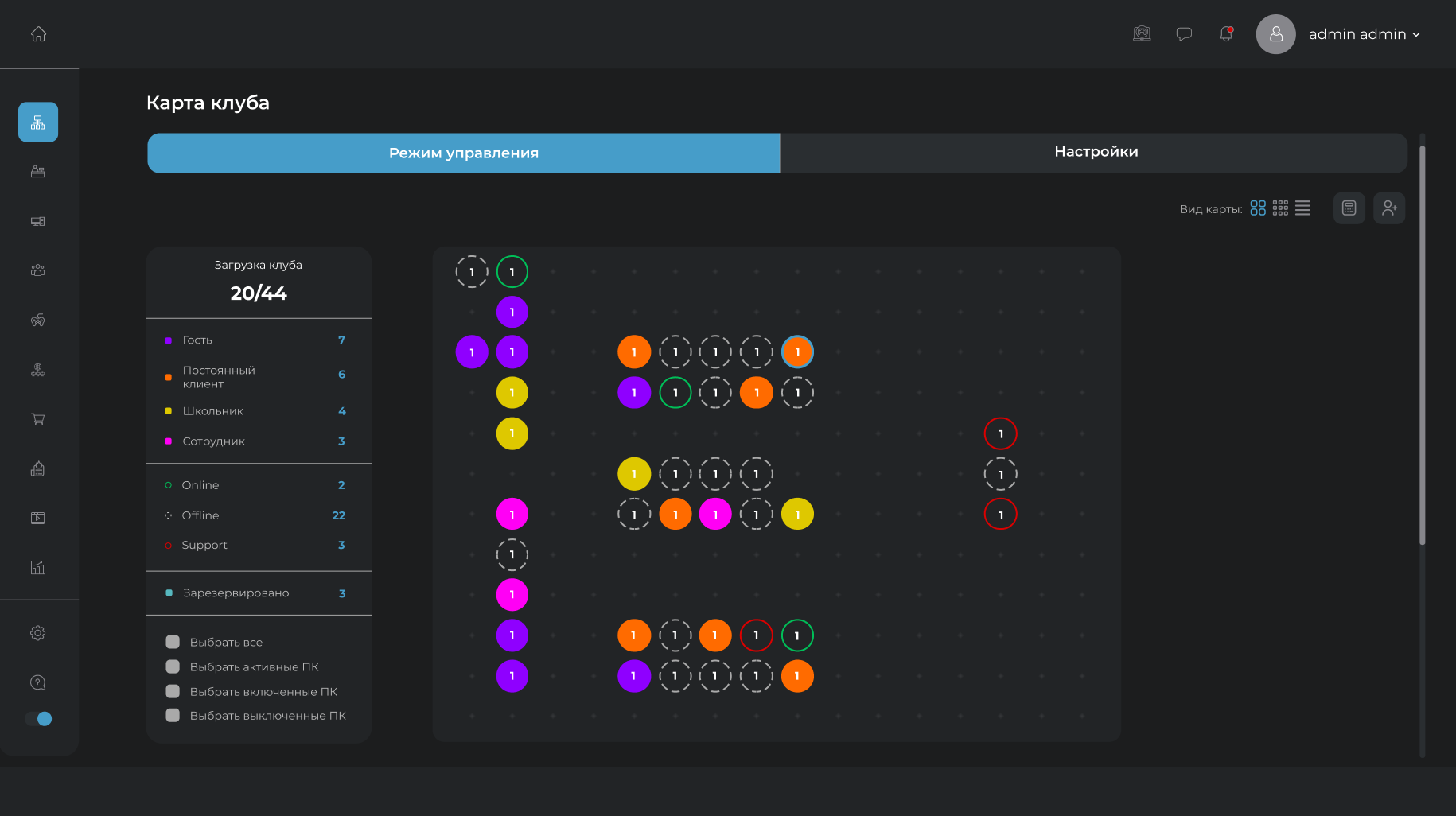 Административная часть (админ панель) – это приложение для работы сотрудников клуба, которое устанавливается в операционной системе Windows. Поддерживаемые версии: начиная с версии Windows10 (рекомендуем использовать данную версию). В админ панели Вы будете настраивать тарифы, систему лояльности, совершать необходимые операции, а также управлять клубом и анализировать полученную статистику.